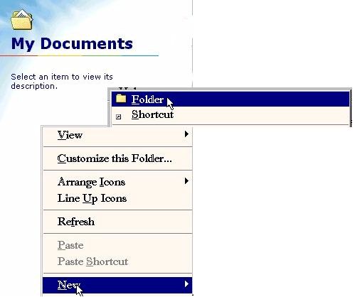 How to Make a New FolderThere are a couple of ways to do this. Bear in mind this is ONE of the ways. 1. Double click on your My Documents icon. ![]() 2. You should now be in your My Documents folder. 3. Right click anywhere on the solid color background. ![]() 4. Now click on New, and then on Folder 5. You will now see the New Folder ![]() 6. Since "New Folder" isn't a great name for the folder, right click on the folder ![]() 7. Now you click on Rename ![]() 8. The "box" under the Folder icon will now be highlighted in blue ![]() 9. Type in the name you want your new folder to be. ![]() |